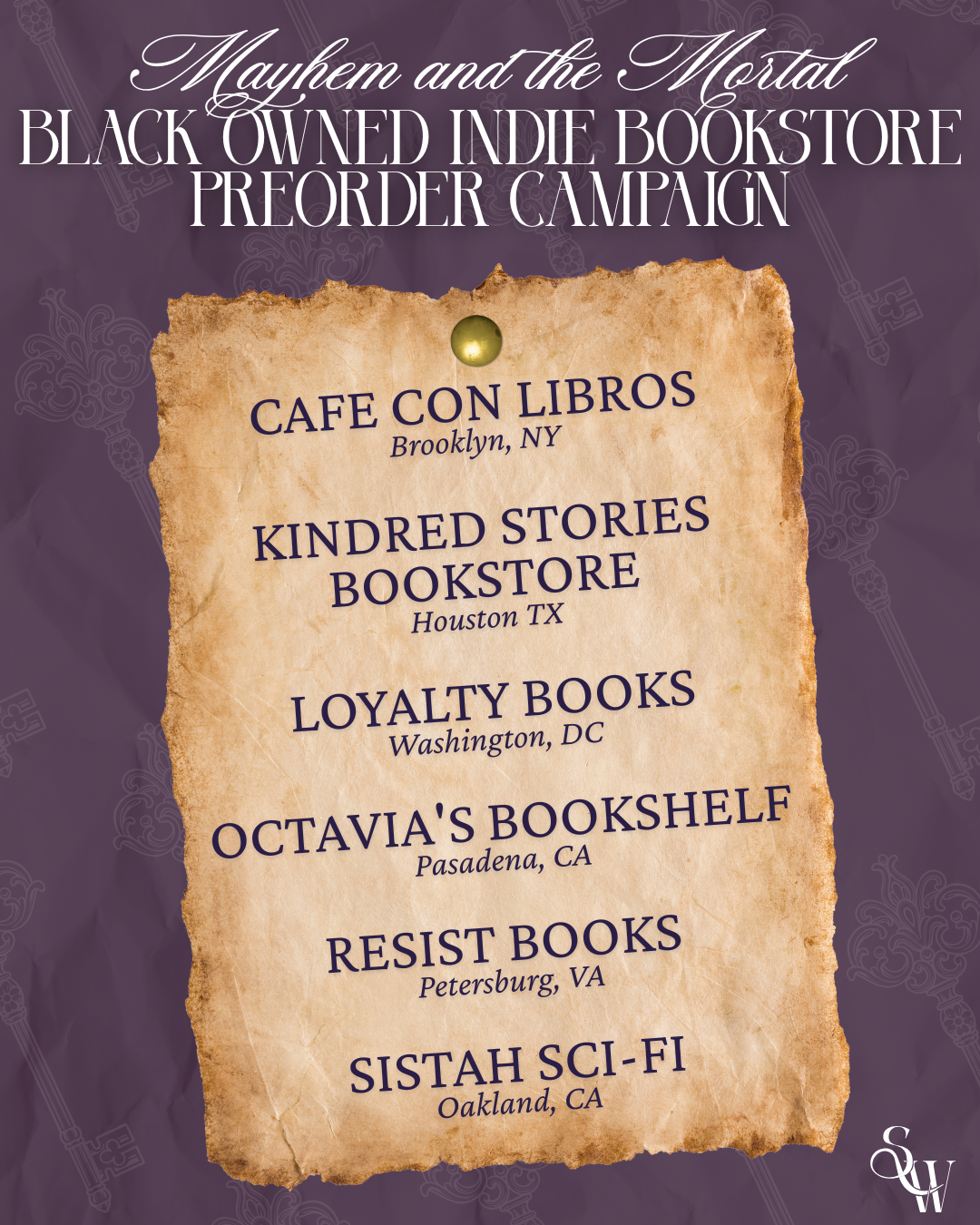 I’ve teamed up with some of my favorite Black Owned Indie Bookstores for a Mayhem and the Mortal Preorder Incentive Campaign!